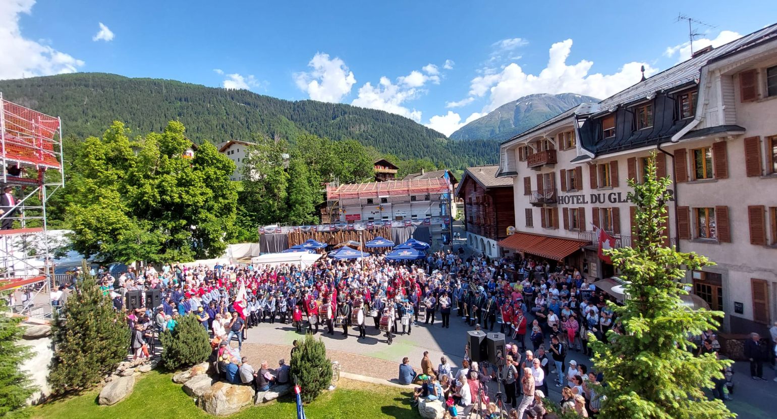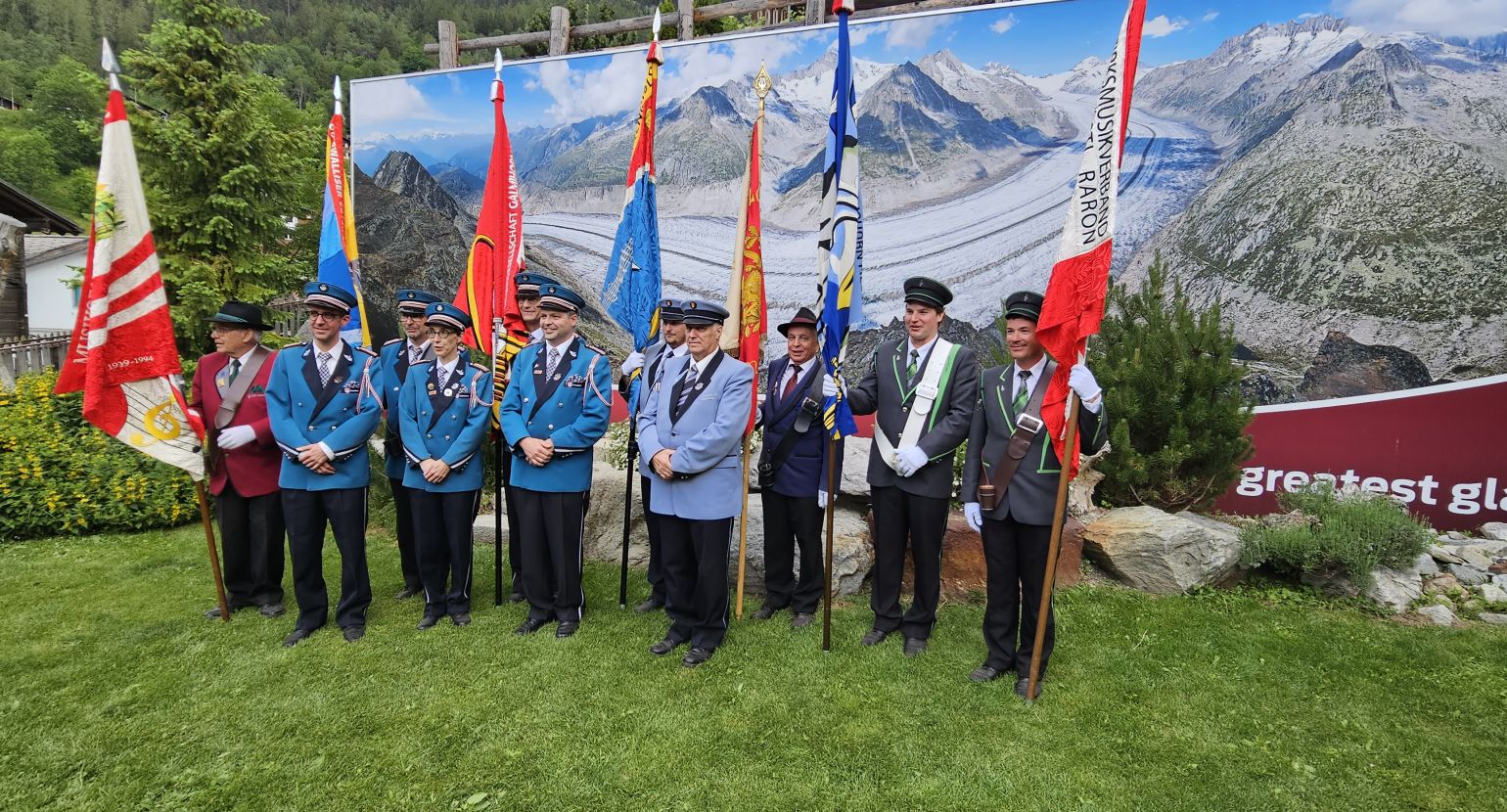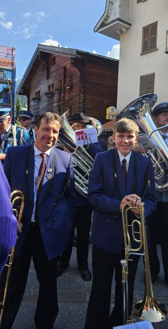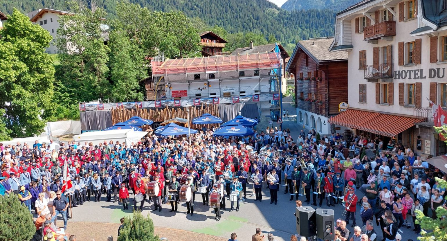 Wie üblich begannen wir mit dem Ausmarsch in Ernen. Dieses Mal war es besonders unkompliziert, da wir mit den öffentlichen Verkehrsmitteln anreisen konnten und keinen eigenen Bus organisieren mussten. Um 16:00 Uhr begann dann der Einmarsch vom Coop bis zum Dorfplatz in Fiesch. Anschließend fand das Gesamtspiel statt, einschließlich der feierlichen Fahnenübergabe.