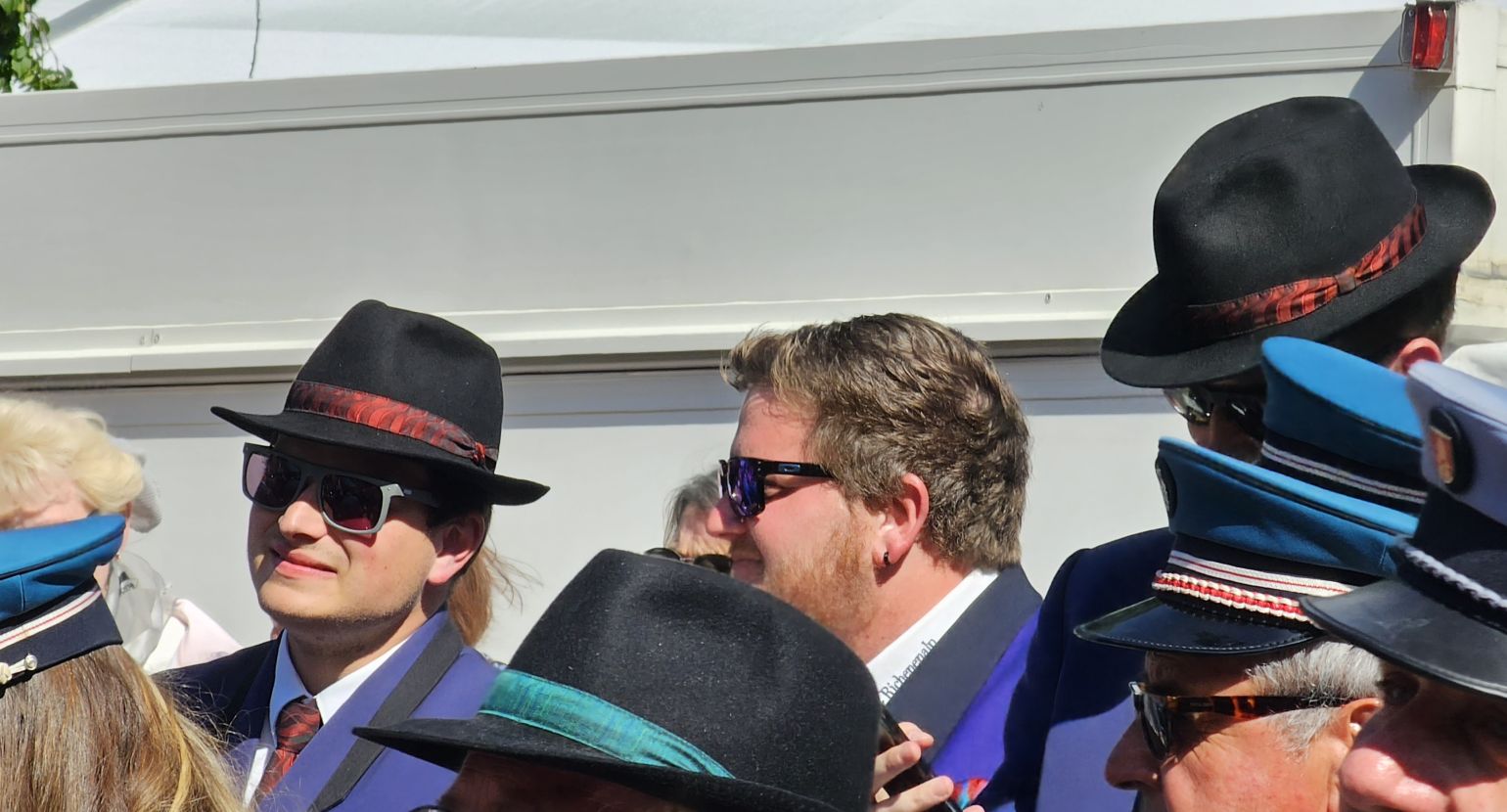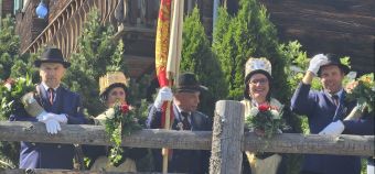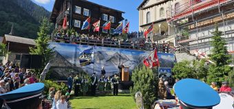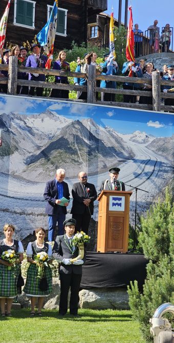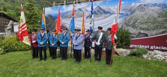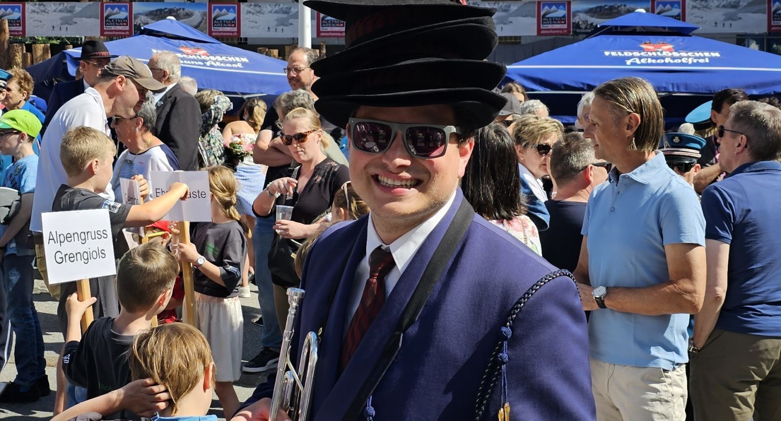 Wie üblich begannen wir mit dem Ausmarsch in Ernen. Dieses Mal war es besonders unkompliziert, da wir mit den öffentlichen Verkehrsmitteln anreisen konnten und keinen eigenen Bus organisieren mussten. Um 16:00 Uhr begann dann der Einmarsch vom Coop bis zum Dorfplatz in Fiesch. Anschließend fand das Gesamtspiel statt, einschließlich der feierlichen Fahnenübergabe.