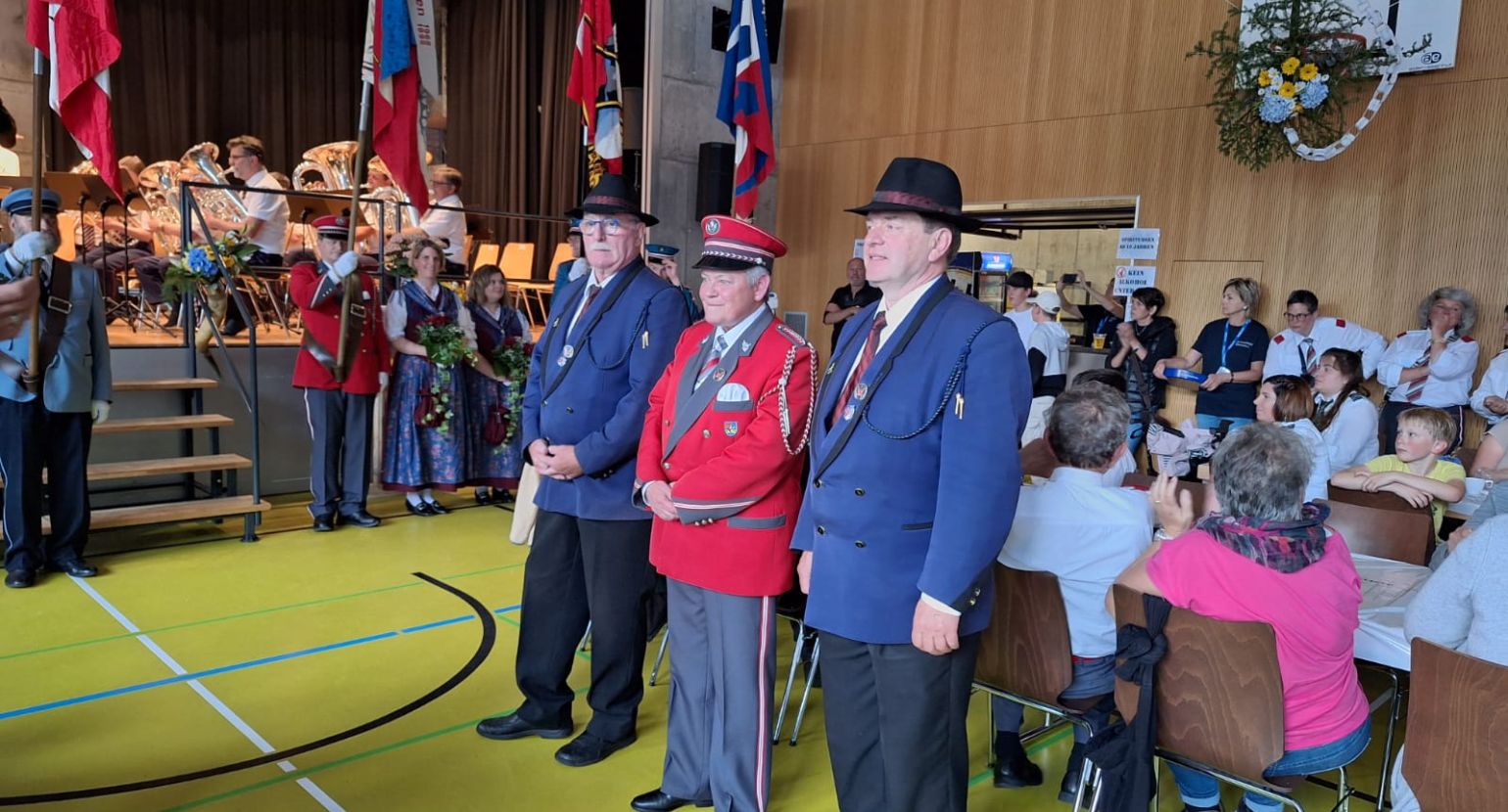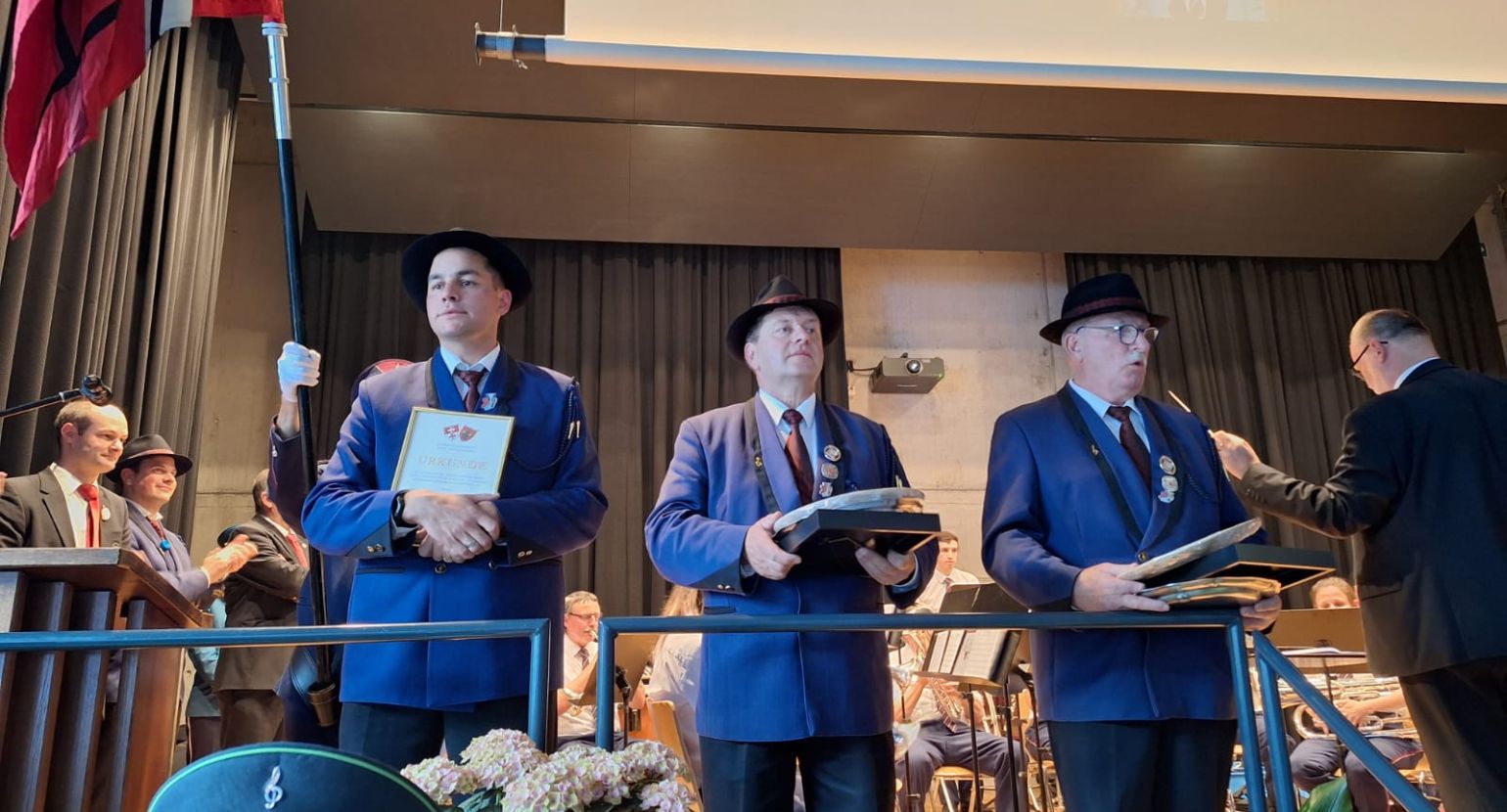 Anschliessend standen die Veteranenehrungen auf dem Programm. Drei unserer Musikanten durften die Medaille und Ehrung für ihr 25- und 50-jähriges Jubiläum entgegennehmen.