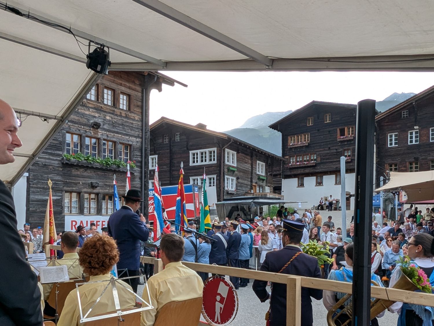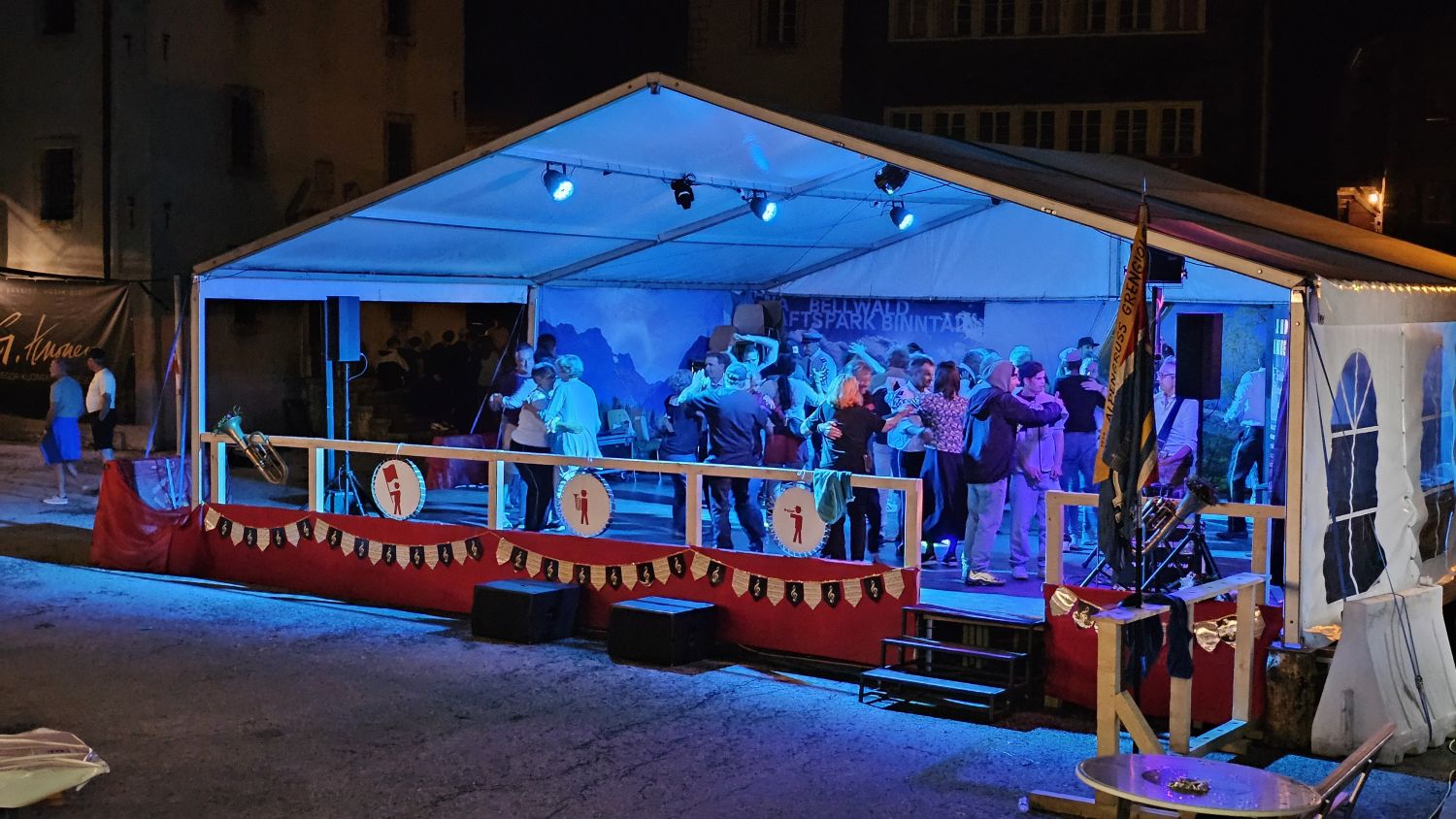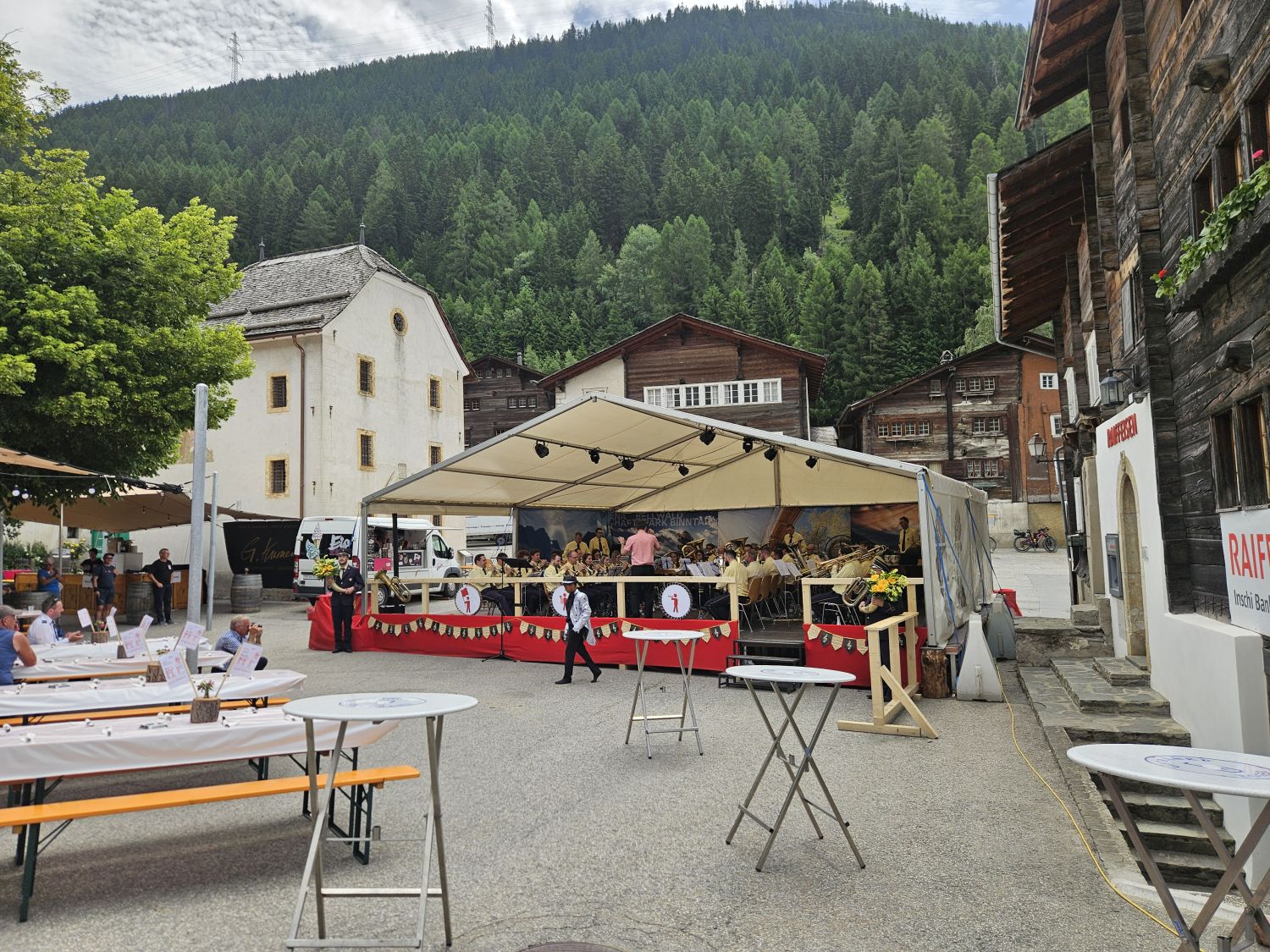 Eine intensive und arbeitsreiche Woche liegt hinter uns. Bereits am Dienstag starteten wir mit dem Aufbau der Infrastruktur. Das neue Tentikle-Zelt der Gemeinde Ernen wurde errichtet und erwies sich während des Festes als wahrer Glücksgriff. Am Mittwoch folgte der Aufbau der Bühne, am Donnerstag das Bühnenzelt sowie die weiteren notwendigen Einrichtungen für das leibliche Wohl unserer Gäste. Der Feinschliff – Dekoration und Bestuhlung – wurde am Freitag erledigt, pünktlich vor dem Auftakt.