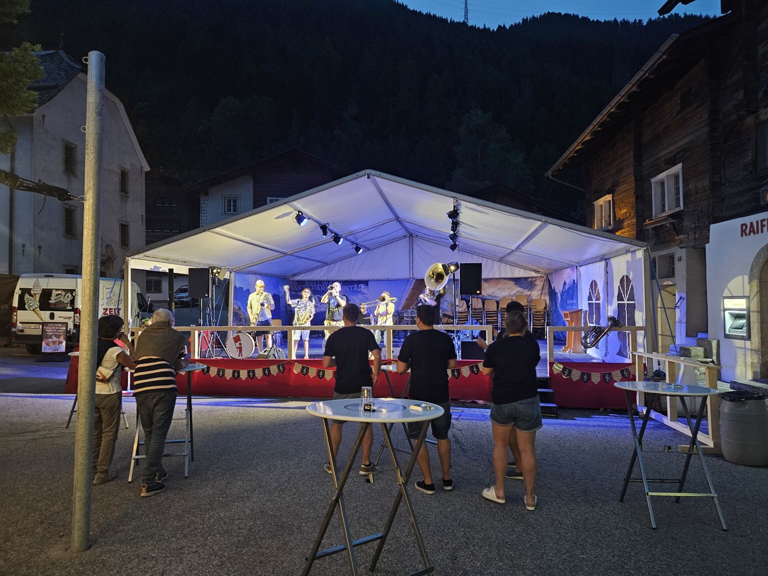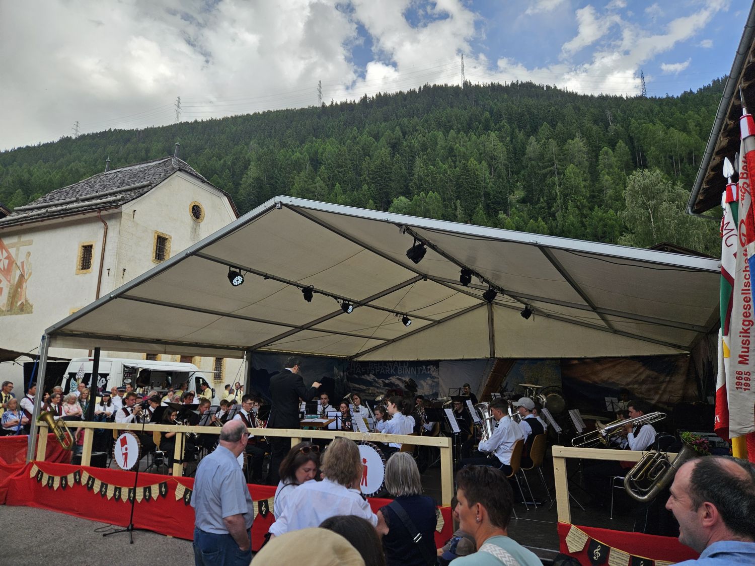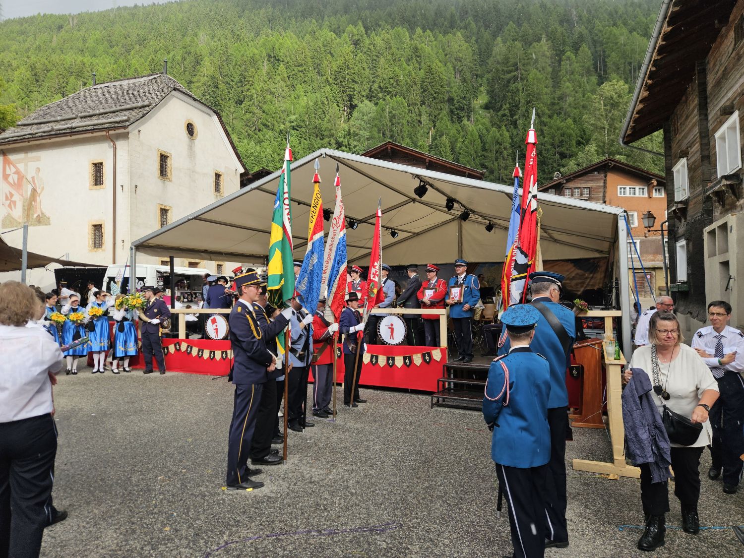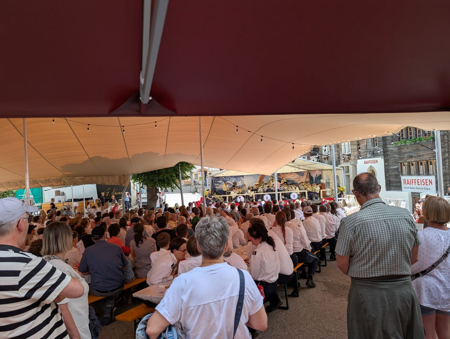 Eine intensive und arbeitsreiche Woche liegt hinter uns. Bereits am Dienstag starteten wir mit dem Aufbau der Infrastruktur. Das neue Tentikle-Zelt der Gemeinde Ernen wurde errichtet und erwies sich während des Festes als wahrer Glücksgriff. Am Mittwoch folgte der Aufbau der Bühne, am Donnerstag das Bühnenzelt sowie die weiteren notwendigen Einrichtungen für das leibliche Wohl unserer Gäste. Der Feinschliff – Dekoration und Bestuhlung – wurde am Freitag erledigt, pünktlich vor dem Auftakt.