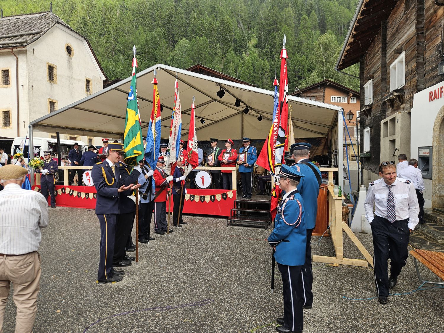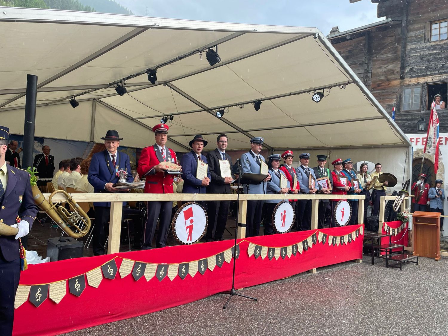 Am Nachmittag folgte der traditionelle Einmarsch der Musikgesellschaften. Dieser konnte noch bei trockenem Wetter stattfinden, beim Gesamtspiel fielen dann ein paar Regentropfen. Der Festakt selbst wurde dennoch in einer wunderschönen Kulisse würdig gefeiert. Im Anschluss zeigten die teilnehmenden Musikgesellschaften sowie die Jugendmusik ihr Können auf der Bühne – das Publikum war begeistert. Auch die Veteranenehrung wurde feierlich durchgeführt: