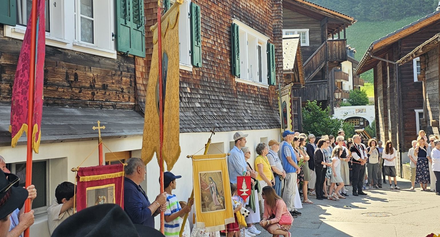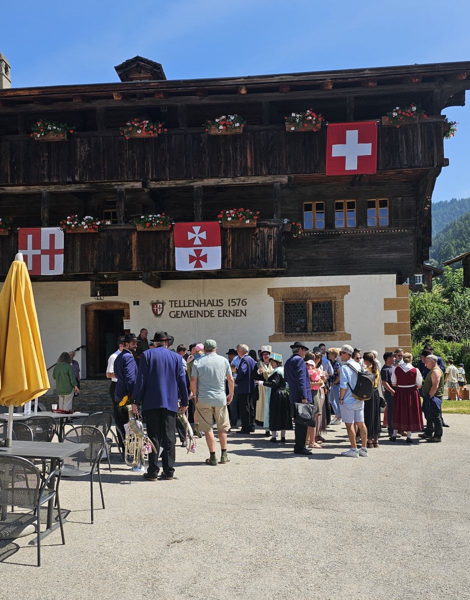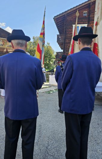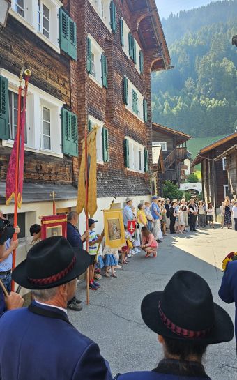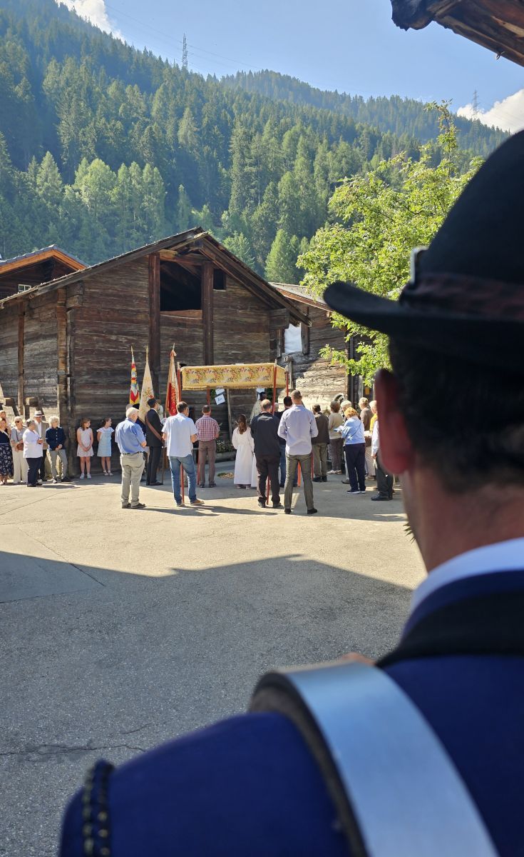 Frisch gestärkt hieß es dann: Tenüwechsel in die Uniform und bereitmachen für den feierlichen Einmarsch zur Kirche. Nach der Messe folgte die Prozession durchs Dorf, die wir bei bestem Wetter und vor einer beeindruckenden Kulisse anführen durften. Die Prozession war einfach wunderschön und ein besonderes Erlebnis für alle Beteiligten. Zum Abschluss gaben wir noch ein Ständchen auf dem Dorfplatz – der perfekte musikalische Rahmen zum Aperó.