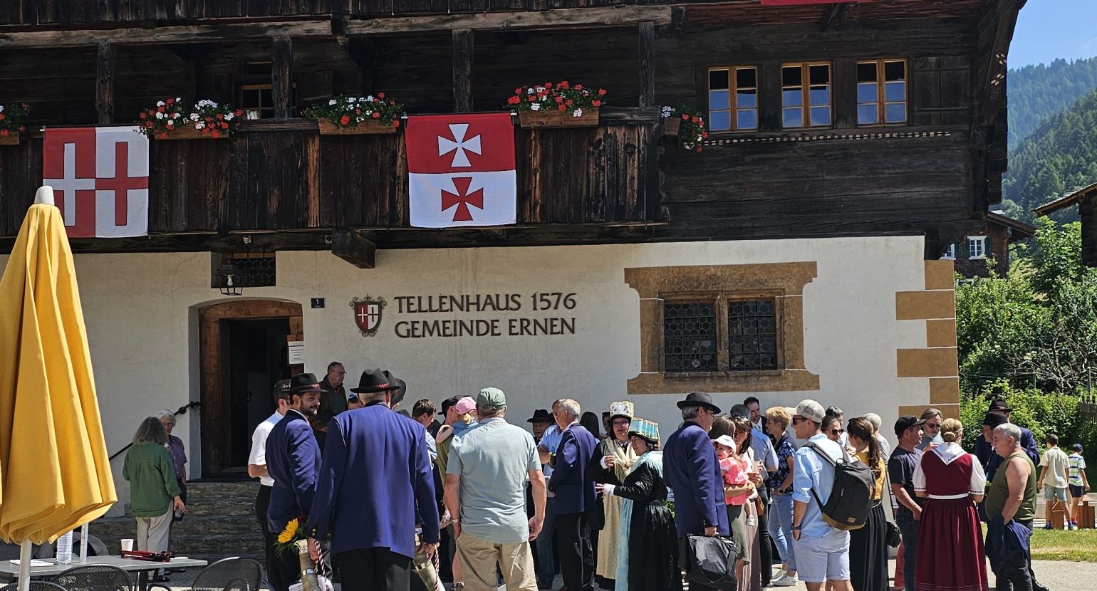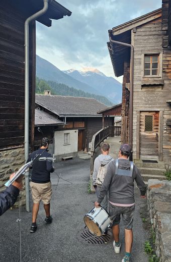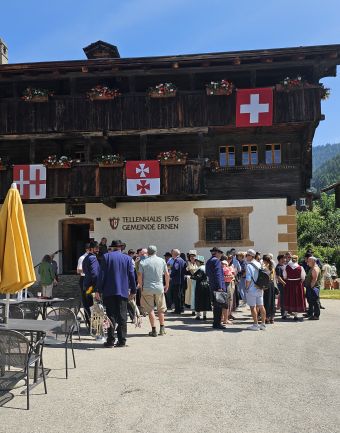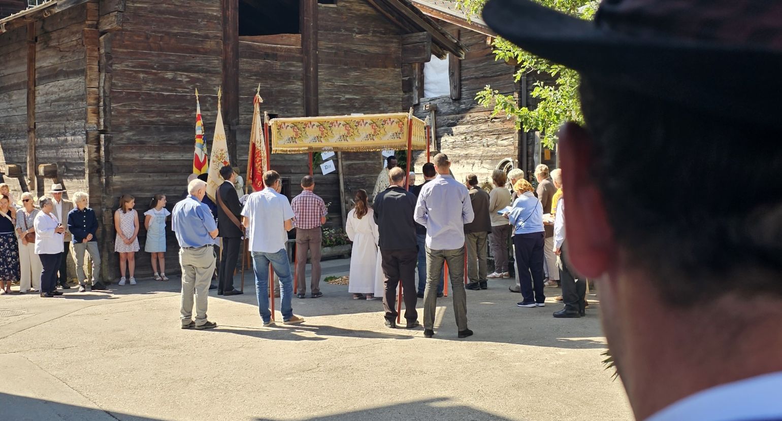 Frisch gestärkt hieß es dann: Tenüwechsel in die Uniform und bereitmachen für den feierlichen Einmarsch zur Kirche. Nach der Messe folgte die Prozession durchs Dorf, die wir bei bestem Wetter und vor einer beeindruckenden Kulisse anführen durften. Die Prozession war einfach wunderschön und ein besonderes Erlebnis für alle Beteiligten. Zum Abschluss gaben wir noch ein Ständchen auf dem Dorfplatz – der perfekte musikalische Rahmen zum Aperó.