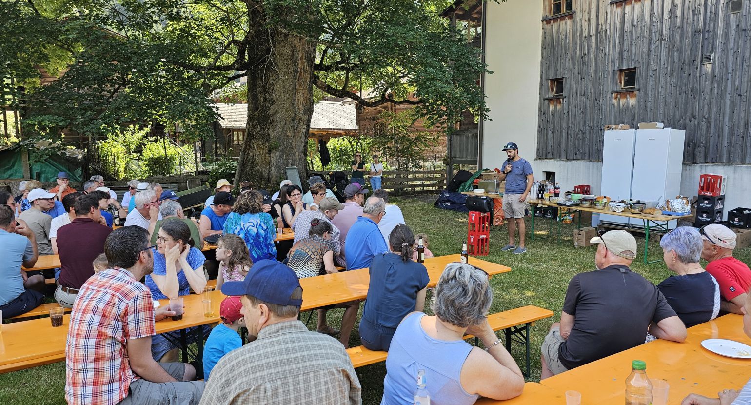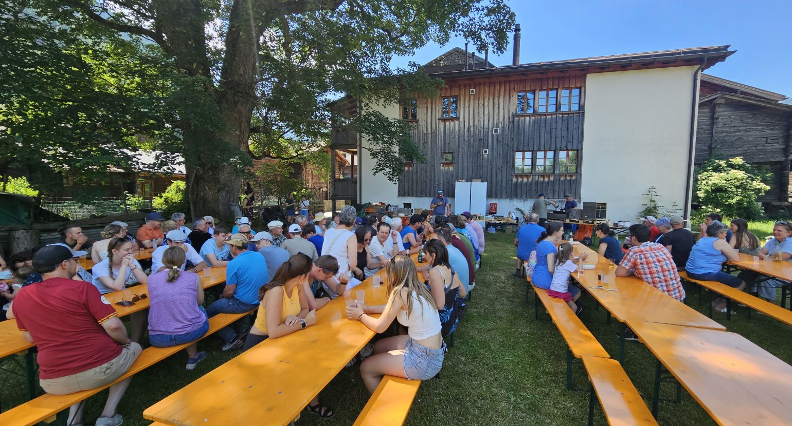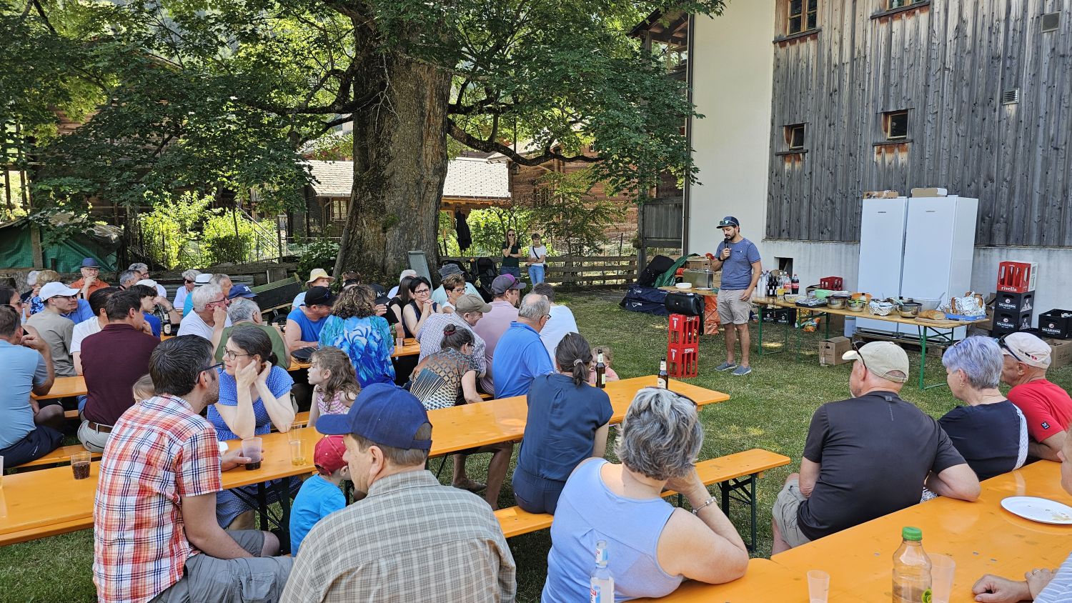 Nach dem offiziellen Teil konnten wir es etwas lockerer angehen: Tenüerleichterung war angesagt. Alle Helferinnen und Helfer unseres Musikfests, die Familien unserer Musikantinnen und Musikanten sowie unsere Veteranen versammelten sich am Mittag beim grossen Ahorn im Mättelti zum traditionellen Familientag und Helferfest. Dieser Tag hat bei uns eine lange Tradition und bildet den krönenden Abschluss unseres Musikjahres nach den Musikfesten im Juni.